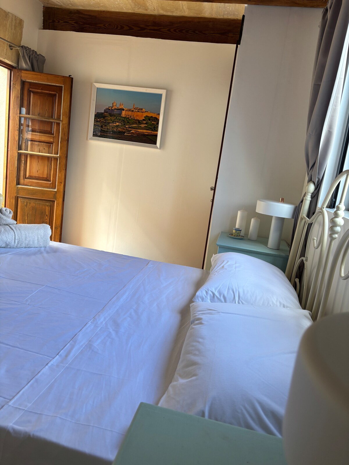 Pokój z balkonem w domu wapiennym sprzed 300 lat w pobliżu Mdiny — jedno łóżko, autentyczna architektura. Mdina to Ciche Miasto, jedno z najlepiej zachowanych średniowiecznych miast Europy — nocleg przy nim to zupełnie inne doświadczenie niż pobyt w nadmorskim kurorcie.