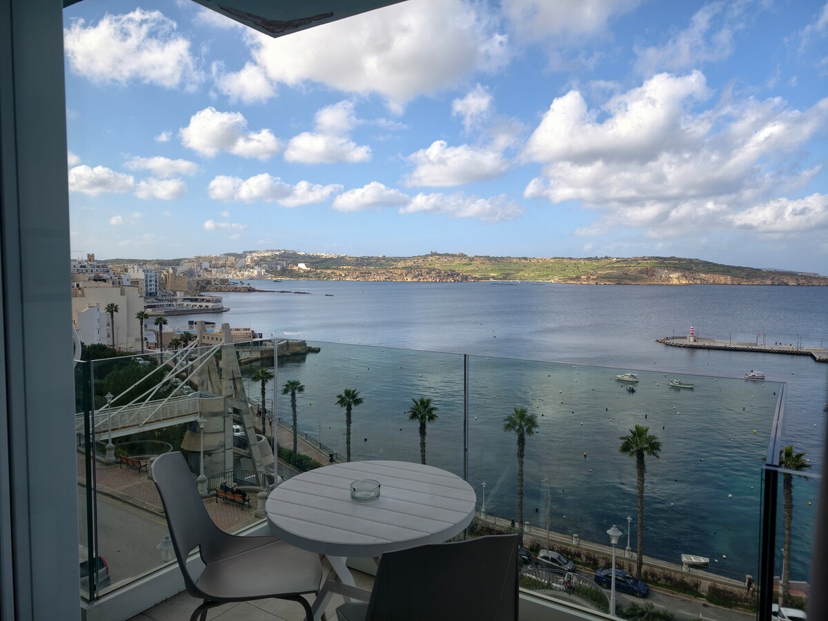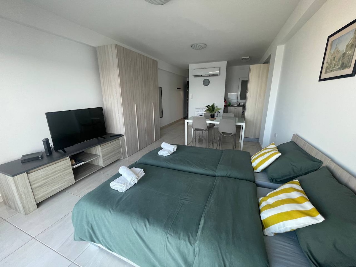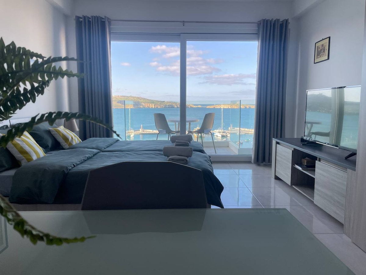 Studio na froncie morskim z balkonem i widokiem na zatokę w Bugibbie — jedna sypialnia, jedno łóżko. Ładny widok na morze prosto z balkonu, dobrze wyposażone. Dla pary lub singla w jednym z najpopularniejszych kurortów na Malcie.