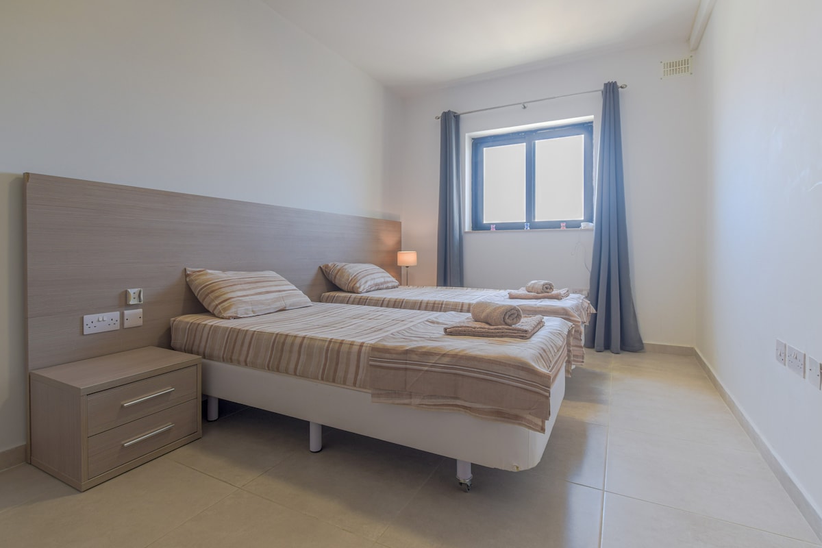 Nowoczesny pokój z dwoma pojedynczymi łóżkami w Bugibbie, blisko morza i restauracji przy promenadzie. Dobry wybór dla dwóch przyjaciół lub rodzeństwa chcących bazować w północnej części wyspy.