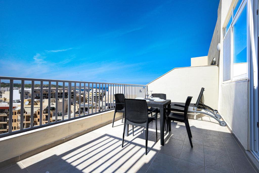 Przestronny, cicho położony penthouse z dwiema sypialniami i dużym tarasem z widokiem na morze w Bugibbie. Dobra opcja dla pary lub rodziny szukającej spokoju bez rezygnowania z dostępu do kurortu — promenada i morze są blisko, bez ulicznego hałasu.